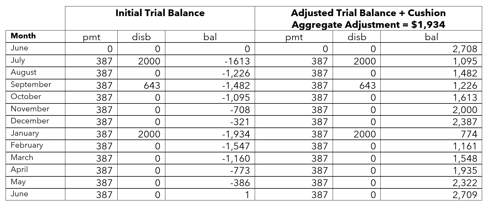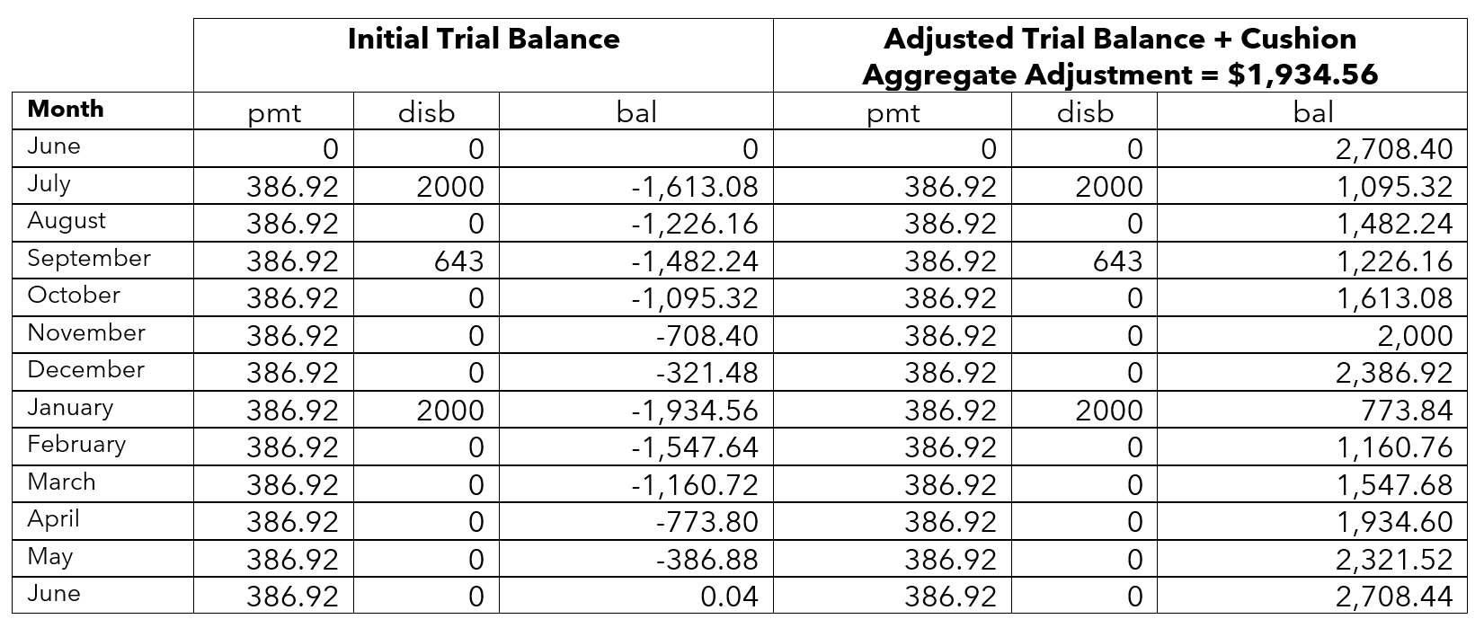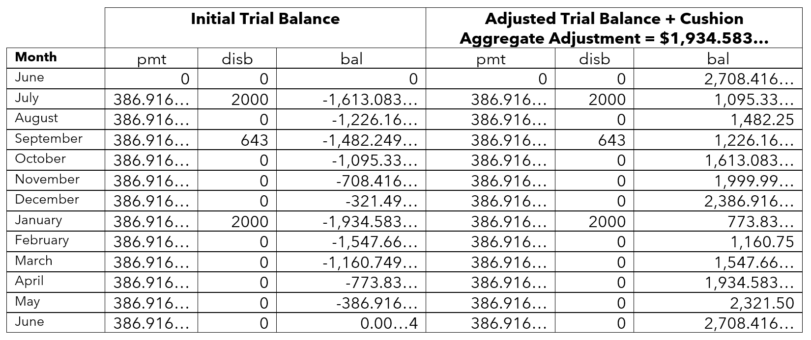 When these calculations are applied to the example above, the resulting amounts are of infinite decimal places (partial cents). One-twelfth of the estimated total annual escrow account disbursements equals $386.9166… and the cushion would equal $773.833… Using these numbers, the trial balances would be as follows for the first two stages of the analysis (with “…” indicating continuing digits):
